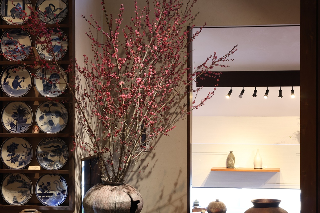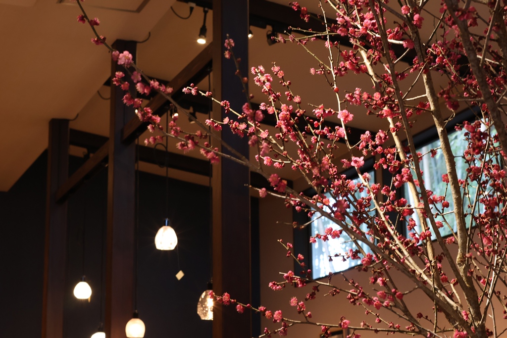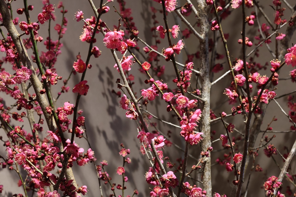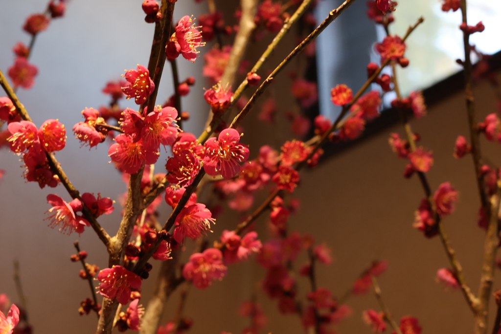 今年は1月の末に実家の紅梅の枝を採って来ました。何本もある梅の木の中でもこの紅梅は花が大きくたくさんの花を咲かせてくれる種類です。週末に満開になるように店内に生け込むと一気に満開になってしまいました。