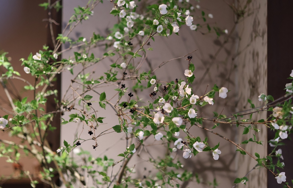 実家の土手に白山吹を植えたのは20年以上前のこと。大きく育てては店内に飾るために切って生け込み、また数年かけて大きく育てる繰り返しを続けてきました。